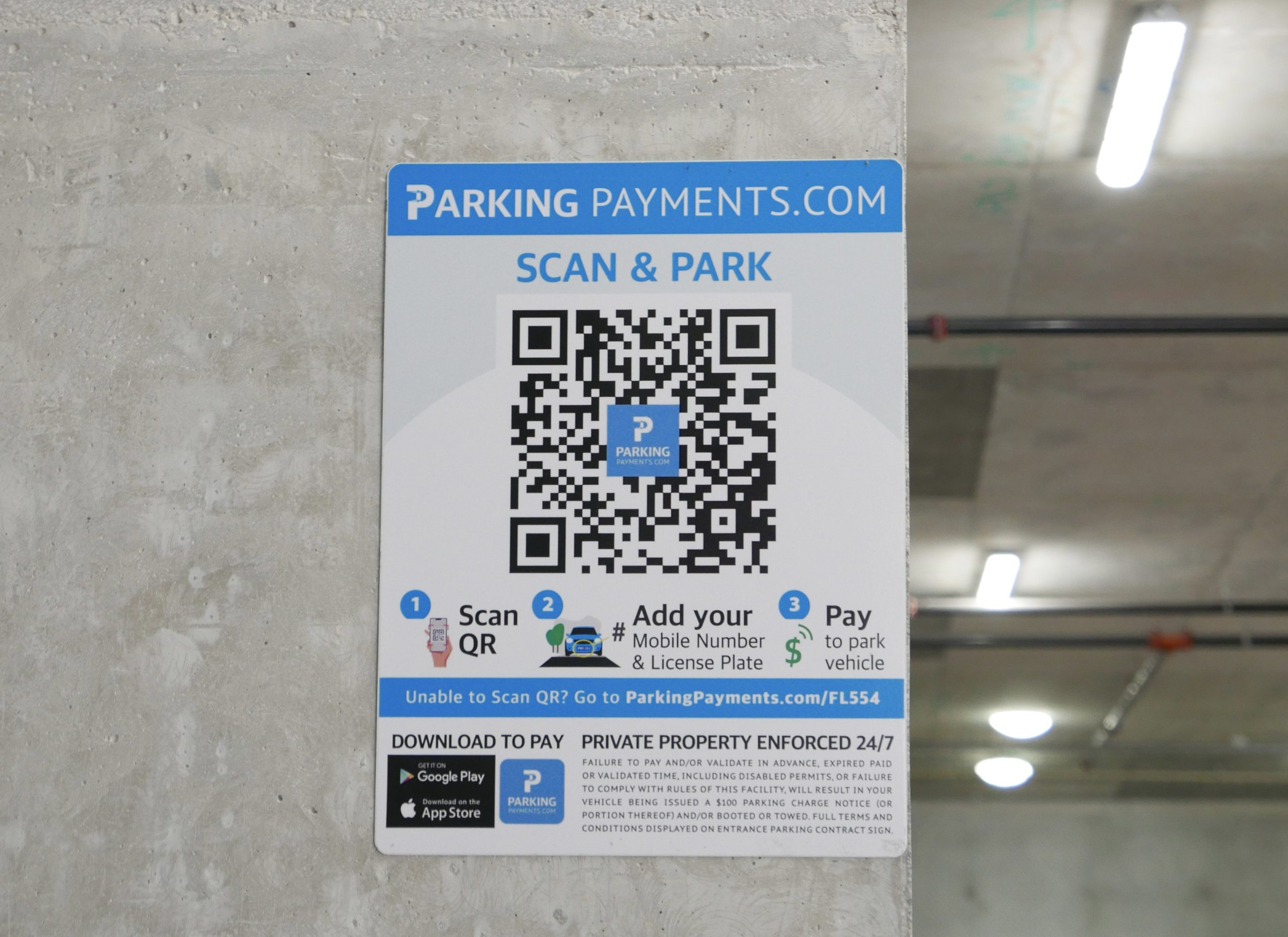 Enter your phone number + license plate for 2 hours complimentary parking.